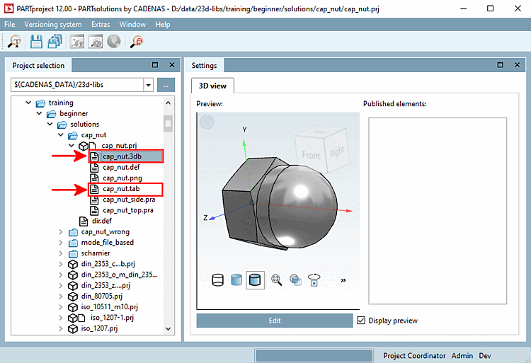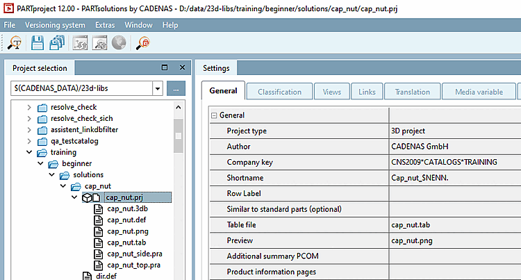 -> In PARTproject under Project selection, you will find the training catalog with the subfolder beginner/solutions/cap_nut in the directory tree.