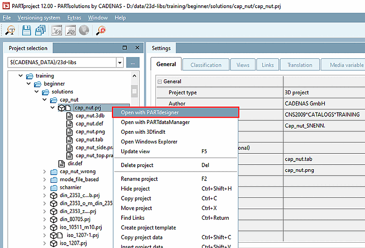 Alternatively, you can PARTdesigner if you select the file cap_nut.prj and then click on the context menu command Open with PARTdesigner .