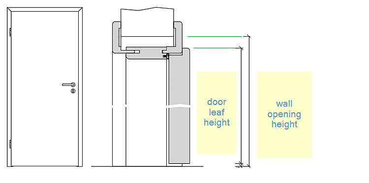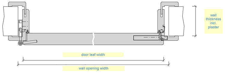 Wall opening width and height (must be wider and higher than the door leaf width/height because of mounting spaces) Common values for added spacing are: +35mm width and +17.5mm height. These values must be worked out and finalized with the manufacturer in the project workshop.