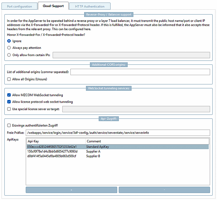 WebSocket tunneling is activated in the category PARTsolutions > Application Server > AppServer Service, on the Cloud Support [Cloud-Support] Tabbed page. This functionality is activated by default. If it is not to be used, the corresponding checkboxes should be removed here.