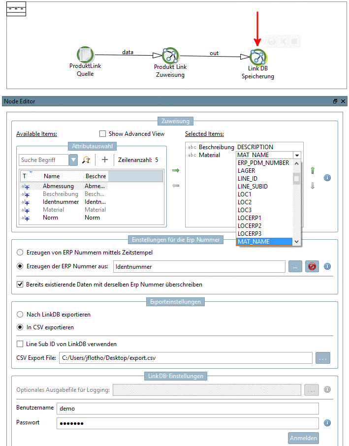 Mapping: Determine the mapping between CSV fields and LinkDB fields. In the example in hand, a mapping is performed for Description and Material. Move the desired variables from the left to the right via arrow key. Open the list field on the right side and select the corresponding LinkDB fields (here DESCRIPTION and MAT_NAME).
