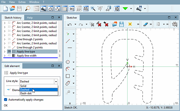 If the option is checked, the line style is also imported. You can then edit the parameters for the line style in the sketch history [Sketch history].