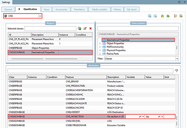 Under Settings -> Tabbed page Classification > List field selection @CNS > Geometrical Properties class, the CNS_NOSECTION feature can be set to Yes.
