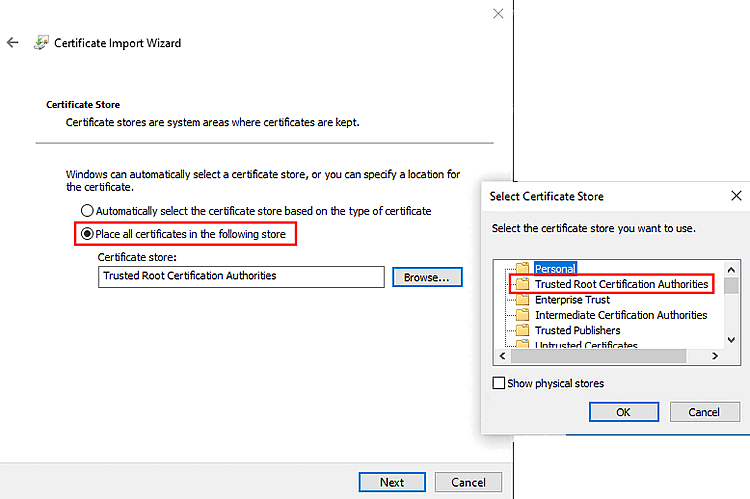 The certificate has been successfully imported in the Local Computer\Trusted Root Certification store.