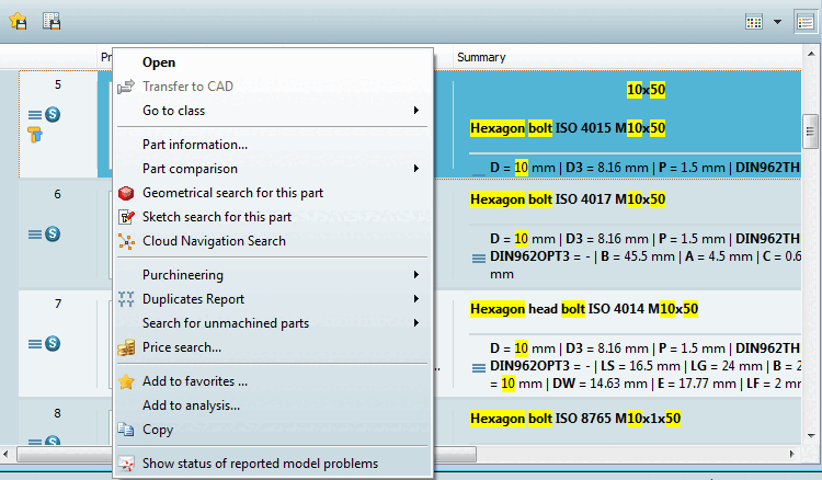 If you move the mouse over a line, corresponding buttons are displayed which you can use to access the part view [Part view] or the part comparison [Part comparison]or to export the relevant part directly to the CAD system.