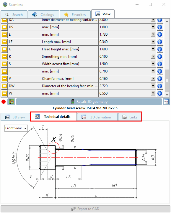 All 3 tabs Technical data [Technical details], 2D derivation and References [Links] are displayed to the right of the 3D view.