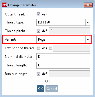 If you want to create a fine pitch thread with defined thread pitches, deactivate the checkbox and enter the variable name for the thread pitch (e.g. 'P ').
