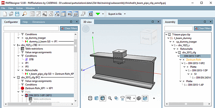 Enter a name (here "t_beam_pipe_clip") and define connection part (here "din_3015_cfg") and connection point (here "Zentrum Rohr_KP1")