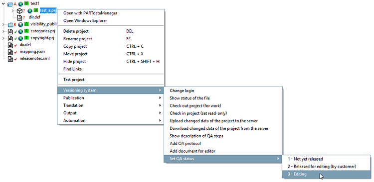 In order to prevent the display of projects (directories) in output media, they do not have to be removed, but it is sufficient to use the context menu command Remove publishing marker [Remove publication mark]. With Set publishing marker [Set publication mark], projects (directories) can in principle be designated for display in output media, whereby other factors also play a role.