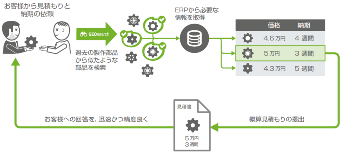 ある企業の場合、自社の顧客は非常に多くの時間と労力をかけて提案依頼書(RFP)の作成を行います。そして同時に迅速な見 積もり提出を期待しています。類似形状検索を用いれば、過去に受注実績のある見積もり提案を見つけることができます。そし てこの見つかった見積もり提案を修正し、顧客用の見積もり提案を作成することで、少ない労力で提案を行うことができるので、 顧客の期待する迅速な見積もり提出を実現できます。