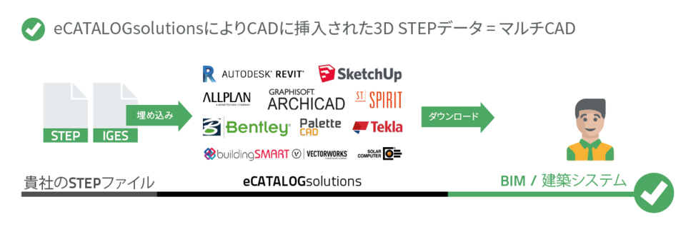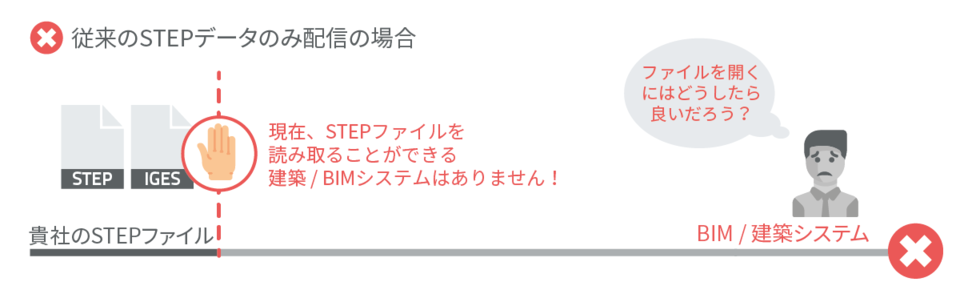 STEPファイルは、ほぼすべての建築やBIM CADシステムにおいてインポートが対応されていません。建築業界ではIFCや3D Studio Maxといったメッシュ方式の形式が一般的になってきており、そのため、IGESやSTEPやPARASOLIDなどの機械系CAD形式は役に立ちません。そのため、STEPファイルを提供するのみでは、建築設計やプラント設計に貴社製品のデータを組み込んでもらうことは難しいでしょう。