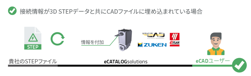 eCATALOGソリューションを使用すると、貴社お手持ちの3D STEPデータをネイティブのCADフォーマットに埋め込み、あらゆる付加情報を追加可能です。この機能は、電気・電子エンジニアリングの分野で95%以上の市場シェアがあり、とてもよく知られているCADシステム、eCl@ss ADVANCED形式に対応しています。