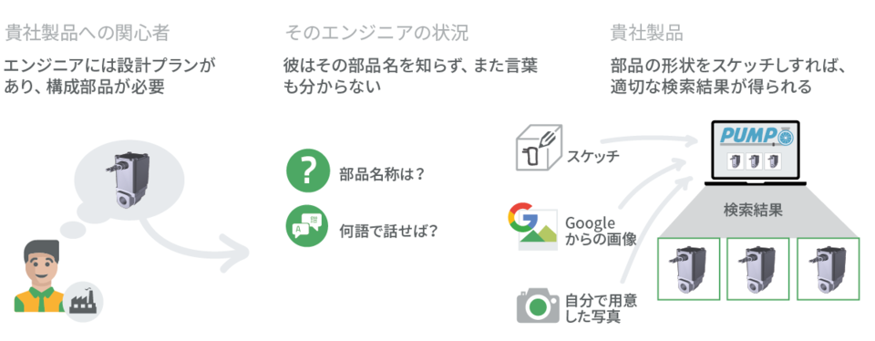 スケッチ検索の機能を使い、貴社顧客または貴社製品に興味を持っている人々は、要望のコンポーネントについて、ざっくりと簡単なアウトラインを描くことができます。または、例えば携帯電話で撮った写真や、検索エンジンで探した画像を、スケッチ部分に読み込ませることも可能です。そうすると製品一覧の中から適切な部品が選び出され、表示されます。