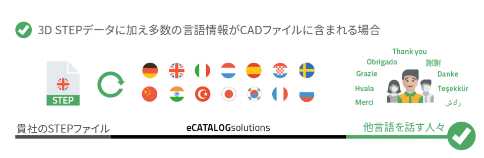 eCATALOGsolutionsでは、貴社お手持ちの3D STEPデータを多数の言語で提供することができます。