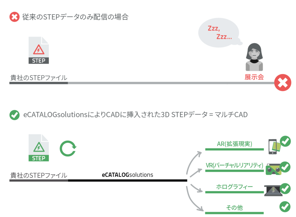 数多くの部品メーカーの中で目立つためには、貴社製品をどこよりも珍しく、面白く、体験型で革新的な方法で展示しなければなりません。貴社お手持ちの3D STEP / CADデータとeCATALOGsolutionsを用いれば、AR(拡張現実)、VR(バーチャルリアリティー)、ホログラフィーなど、貴社製品を確実に印象に残すためのあらゆる機能が、既に用意されています。