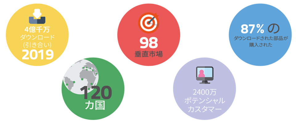 貴社製品の電子CADカタログは、90以上のオンライン市場、ポータル、およびソーシャルコミュニティに掲載されます。貴社製品の電子CADカタログは、10万社以上の企業から1,600万人以上のユーザーに利用される可能性があります。