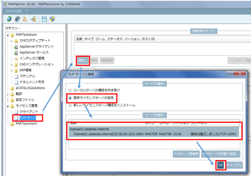2.「カテゴリ:」>「PARTsolutions」>「ライセンス管理」>「FLMサーバ」を選択し、「接続…」ボタンをクリックします。
