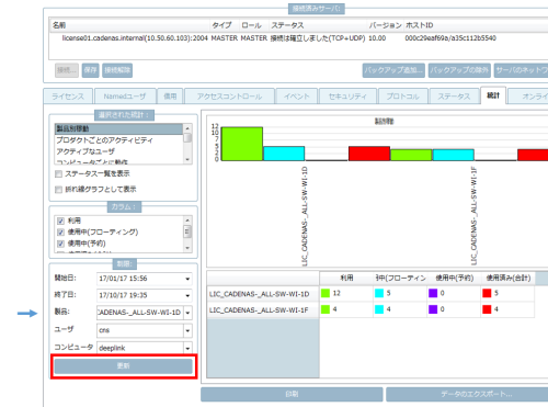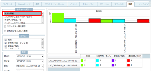 製品別稼動:各製品の利用可能な最大ライセンス数(つまりご購入いただいた数)に対して、実際に利用されたライセンス数に関する統計です。