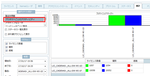 - ライセンス取得:その製品が何回つかまれたかを示します。 例えば「LIC_CADENAS_ALL-SW-WI-1D」(Namedライセンス)の場合、1057回取得されたことを示します。