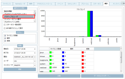 - ライセンス取得:そのユーザーが何回ライセンスを掴んだかを示します。 例えば「web2cad」ユーザは「10500」回使用したことを示します。