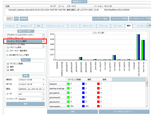 - ライセンス取得:そのコンピュータが何回ライセンスを掴んだかを示します。 例えば、ホスト名「deeplink」から「6」回使用されたことを示します。