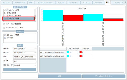 - コンピュータの数:その製品がどのくらいのコンピューターからアクセスがあったかを示します。 例えば「LIC_CADENAS_ALL-SW-WI-1D」(Namedライセンス)の場合、「10」のコンピュータからアクセスがあったことを示します。