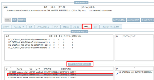 - 使用中(フローティング):「利用」のうち何ライセンス利用実績があるかです。例えば「LIC_CADENAS_ALL-SW-WI-1D」(Namedライセンス)の場合、「12」ライセンス購入のうち「5」ライセンス使用された実績があります