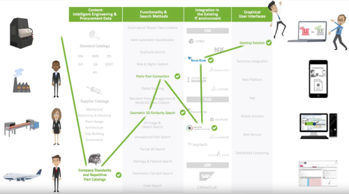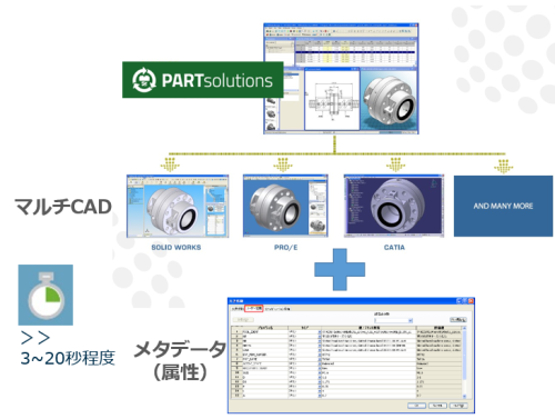 CADENASのPARTsolutionsは設計者や購買者に対し、標準規格部品、サプライヤ部品、そして自社製作部品を、迅速に検索するためのユニークな多くの検索手法が標準機能として備わった統合パーツデータ管理ソリューションです。設計部門や購買部門におけるパーツにかかるコストの継続的な削減を実現します。
