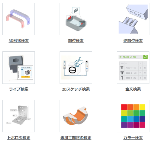 一度発生したパーツデータはとことん有効活用する、パーツデータを行方不明にさせない……ユニーク且つ強力な検索技術でエンジニアのパーツ検索能力は大幅に向上します。「3D形状検索」「部位検索」「トポロジ検索」「2Dスケッチ検索」「フルテキスト検索」「ライブ検索」などなど……。