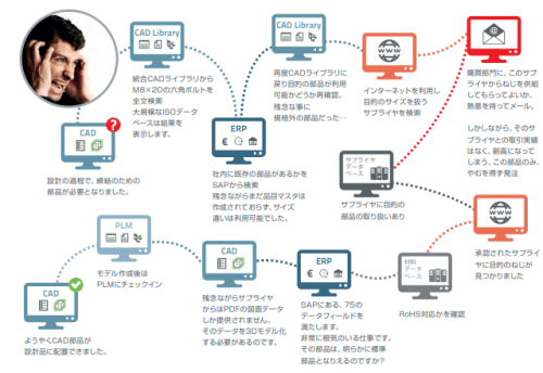 最適な部品の選択および決定は、関連するすべての情報が利用可能な場合にのみ初めて実現します。CADENASの調査では73%もの回答者が、情報取得のために、複数のシステムへのアクセスを強いられていることが判明しました。この場合、エンジニアや購買担当者は、あらゆるシステムを駆使して検索しなくてはなりません。これは時間を無駄にしているだけではなく、本来の業務への集中を妨げることにもなります。