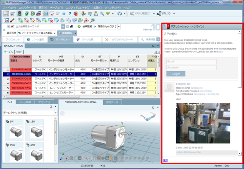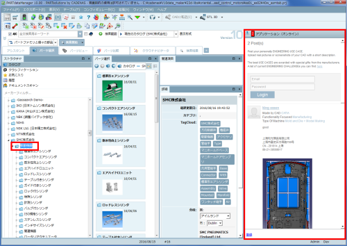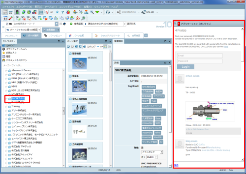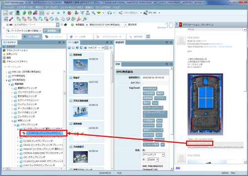 続いてカタログトップの一つ下のサブフォルダを選択すると、件数が減る場合があります。以下の画像の場合、「SMC株式会社」の一つ下のサブフォルダ「駆動機器」を選択すると、右側の利用例の件数が2件に減りました。これは「駆動機器」フォルダ内の部品に関する利用事例は2件存在することを意味します。