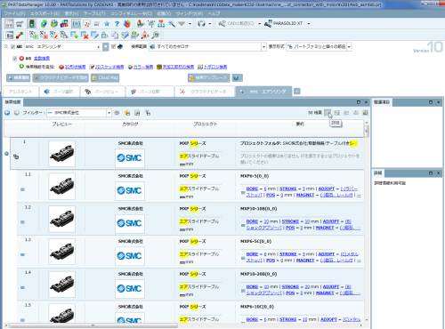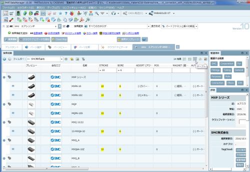 例えば「BORE=6」と「STROKE=10」をクリックすると次のようになります。元々の「smc エアシリンダ」というキーワード検索 AND「BORE=6」 AND「STROKE=10」という検索が実行されたことになります。