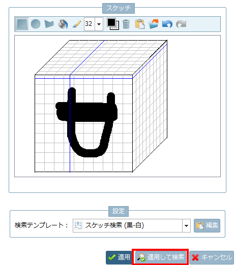 4.描き終わったら「適用して検索」をクリックします。検索結果はありませんでした。しかしデフォルトでは90%以上なので、前述の操作のような絵ではさずがに判別できなかったようです。もう少し低い類似度まで見てみます。「80%の類似度に検索範囲を変更」をクリックします。