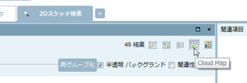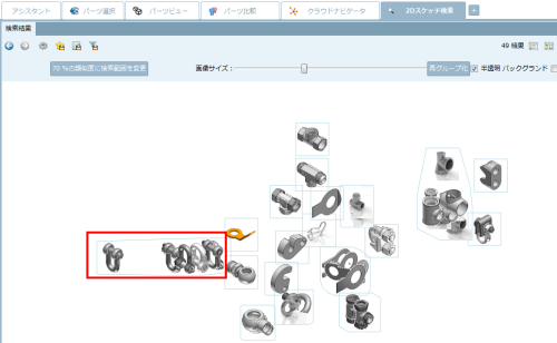 ⇒このとき下の図のように検索結果の表示形式が切り替わります。これは「クラウドマップ」という方法で、形の似ている部品ほど近くに表示し検索結果を上から俯瞰してみることができます。どんな部品が見つかったのか、概要をすばやく把握するのに適しています。
