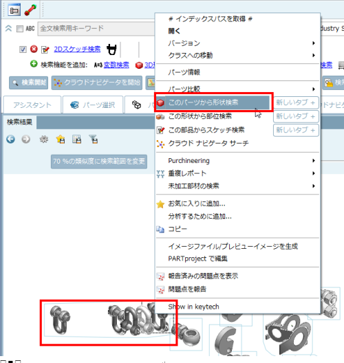 6.赤枠で囲った部品のどれかを選択して、コンテキストメニューを表示させ、「このパーツから形状検索」をクリックします。