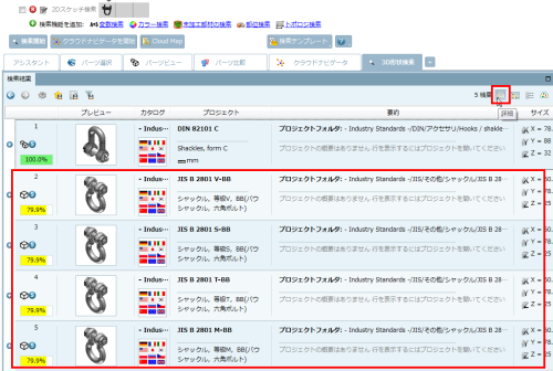 7.今度は操作6で選択した部品を似た部品が表示されます。先頭はその部品自身なので100%です。2~5をみるとJISの「シャックル」という部品であることがわかりました。ここで初めてさがしたい部品は「シャックル」という名称だったと判明します。