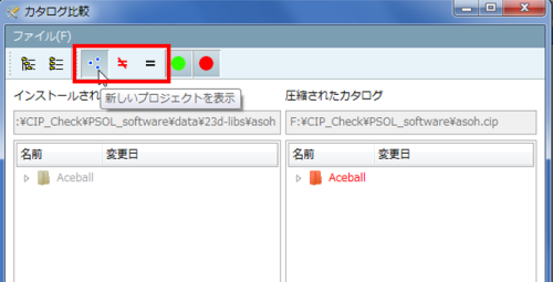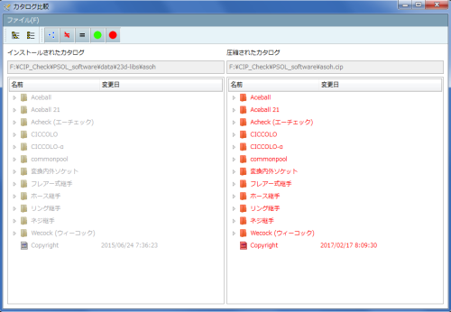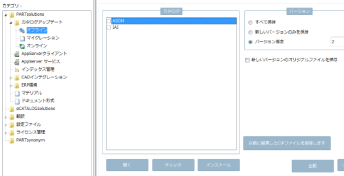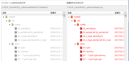 ⇒すると表示されている部品が変更されます。この状態は新旧比較して、どちらか片方にしかない部品のみ表示している状態です。つまり、現在インストールされているカタログ(左側)に表示されている部品は新バージョンには存在しない(つまり削除)されたことになり、逆に新バージョン(右側)に表示されている部品は新しく加わった部品ということになります。