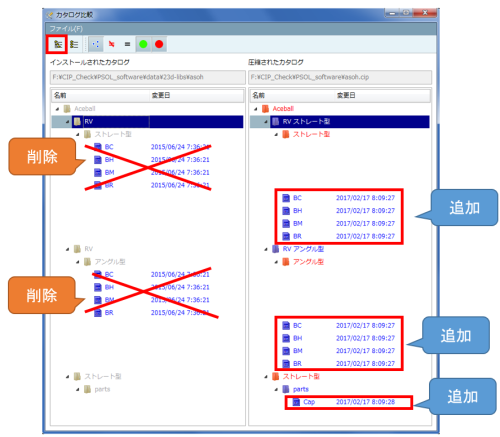 上記例では、「RV>ストレート型>BC(とBH, BM, BR)」が削除され、「RV ストレート型> BC(/BH/BM/BR)」が加わったことになります。最下層の部品名は同じですのでこの例は単にフォルダ階層が変わっただけです。