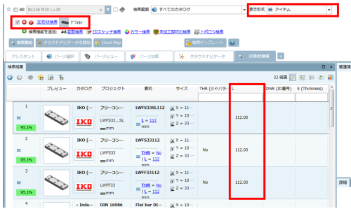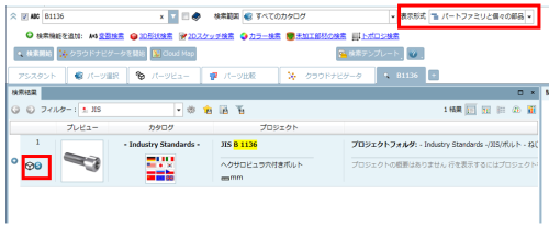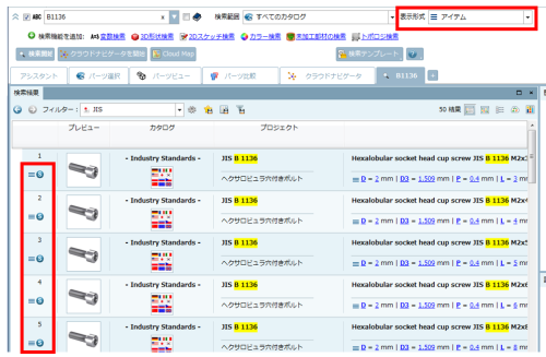 「アイテム」は、検索結果リストに一つの型番または数行と、個別具体的な部品が表示されることを期待する場合に使用します。上記の例の場合「B1136」はJISの規格番号であり、個別具体的な部品単位ではありませんので、表示形式「アイテム」はふさわしいとはいえません。逆に、例えば「B1136 M20 L>30」など規格番号に加え、サイズの情報などを追加すればある程度具体的な部品が特定されるので、この場合には「アイテム」がふさわしいといえます。