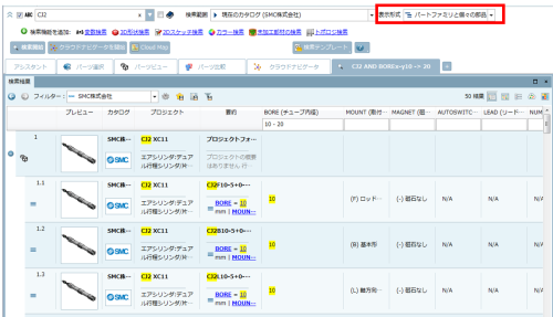 「パートファミリと個々の部品」は、例えば「CJ2シリーズ」など、あまり具体的にサイズまで絞り込みたくないラフな検索結果を期待する場合に使用します。各カラムヘッダー上部にあるインプットフィールドに寸法等フィルタリングする条件を入力することで部品単位まで絞り込んでいくことができます。