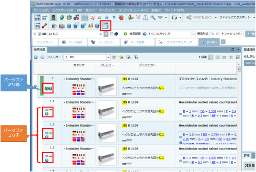 「パーツファミリ親」は部品サプライヤカタログでいうところのシリーズ名に相当し、「パーツファミリ子」がそのシリーズから派生する一意の型式という関係です。