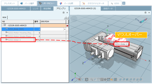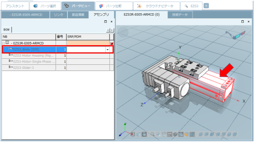 3.「BOM」タブ内のリストで、コンポーネントを選択します。すると左側の3Dプレビュー内で該当するコンポーネントがハイライトされます。