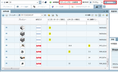 メーカー名はわかっているなど、探したい部品がある程度特定されている場合検索範囲を絞ってから検索を実行することでレスポンスがアップします。