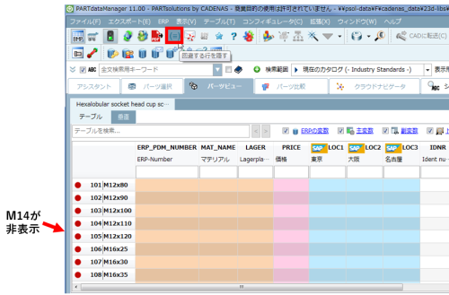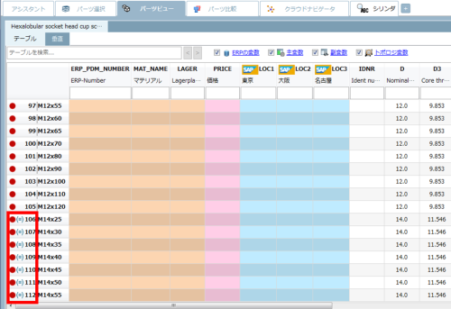 以下「B1136 ヘクサロビュラ穴付きボルト」の例です。 製品データをパーツビューへデータをロードすると「(三)」アイコンが表示されているサイズがあります(下図の赤枠で囲った箇所)。