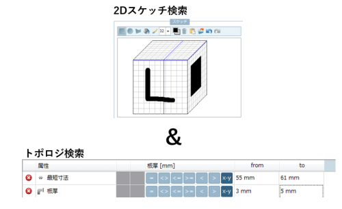 「L字型」は2Dスケッチ検索、「 板厚が3~5mm、短手寸法が50~60mm」はトポロジ検索を使って、それぞれ表現できます。