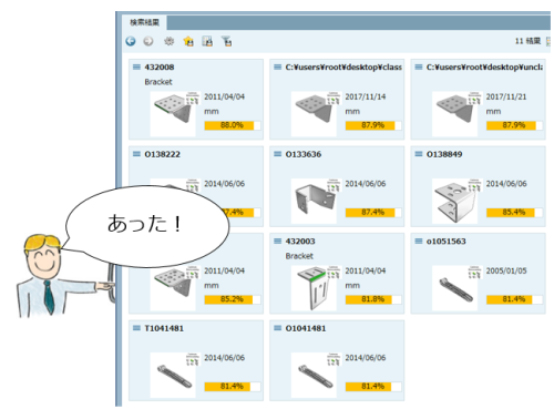 3D CADシステムが使えれば、モデルを描いたほうが早いかもしれませんが、CADシステムがなくても、このように検索を組み合わせれば十分検索可能です。CADシステムがあっても状況によってはCADを起動するよりも素早く手軽に検索することができます。