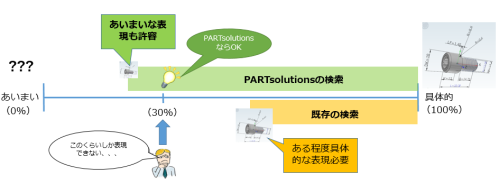 ボルトの画像の大きさであいまいの度合いを表しています。既存の検索の場合、例えば型番の頭3文字、製作者、製作日、分類などある程度具体的な表現であったり、その検索システムへの習熟(どこのフィールドがどの情報、など)も求められます。ではシステムが許容する具体性以下の表現しかできない場合どうなるでしょうか?上記図の「このくらいしか表現できない……」といっている人のような場合です。人に聞くか検索せずに新たに作成してしまうなどでしょうか。では誰も知っている人がいなかったら? 知っている人がたまたま留守だったら? もしデータベース内に要求する部品が存在していた場合、機会損失になります。しかしPARTsolutionsなら、これまで触れたようによりあいまいな表現も許容するインターフェースを備えているため、部品を見つけることができる確率は高くなります。