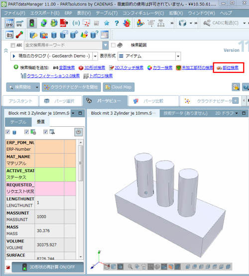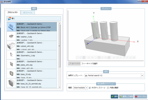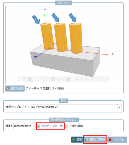 ⇒ここでは以下の画像に示す、3つの円筒を選択しています。この選択で形状はもちろん、この3つの位置関係も検索条件となります。選択後、ダイアログ下部の「ネガティブパーツ」にチェックを入れます。これで対になる部位を持つ部品を検索するモードになります。チェック無しなら同じ部位を持つ部品(つまり、ここではこの3つの円筒と類似し、かつ、同じ位置関係という特徴を持つ部品)