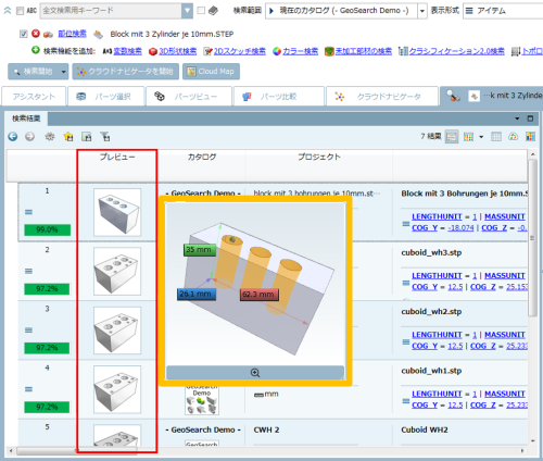 ⇒結果が表示されます。プレビューにマウスカーソルを重ねると3Dプレビューがポップアップされ、どの部位がヒットしたか確認することができます。
