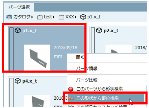 1.穴パターンを持つ部品を選択して「この形状から部位検索」を選択します。